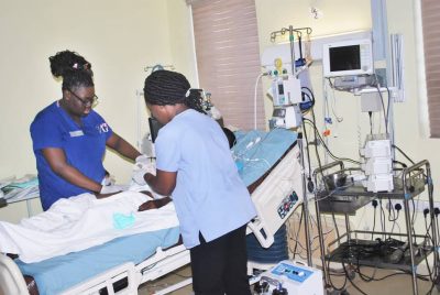 Post surgery patient in ICU being cared for by our team training and mentoring the local ICU team – Real capacity building